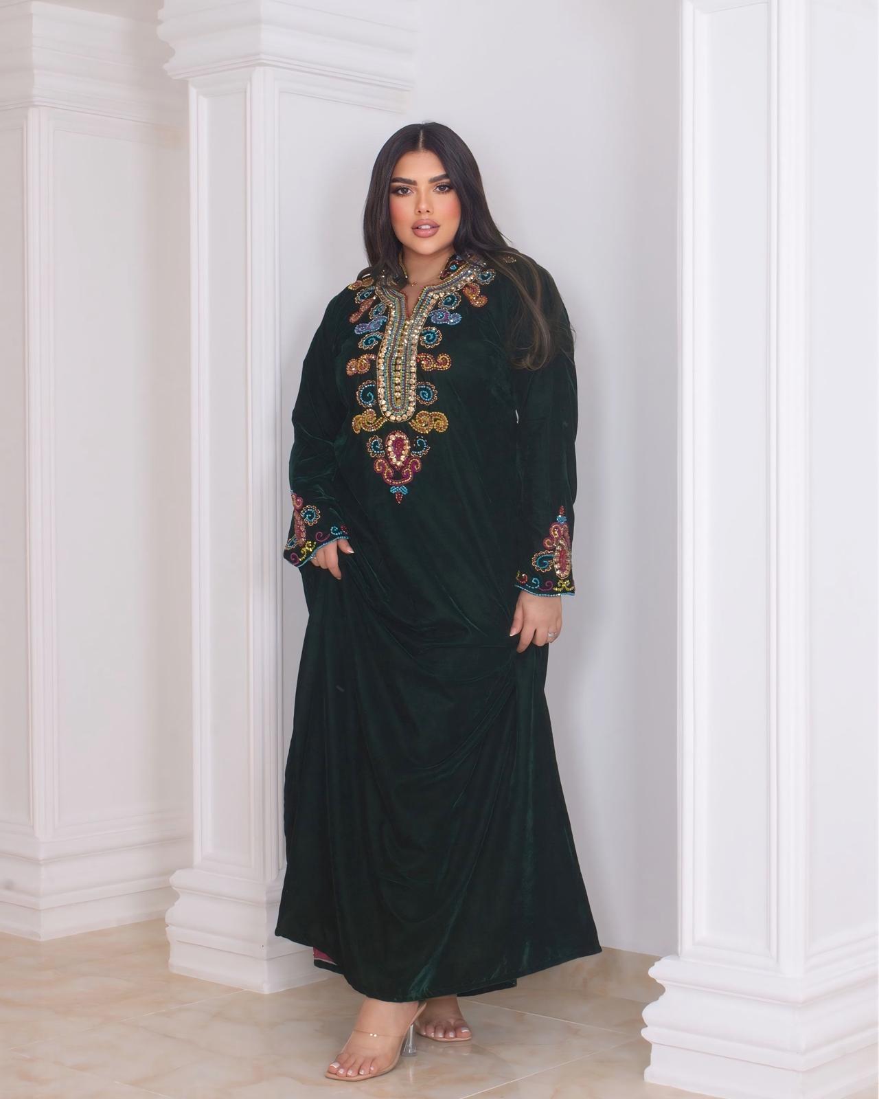 A luxurious emerald velvet kaftan adorned with rich multicolor embroidery along the neckline, chest, and sleeves. Designed with a soft, flowy silhouette, this piece offers both elegance and comfort—ideal for Ramadan gatherings, evening events, and festive occasions.