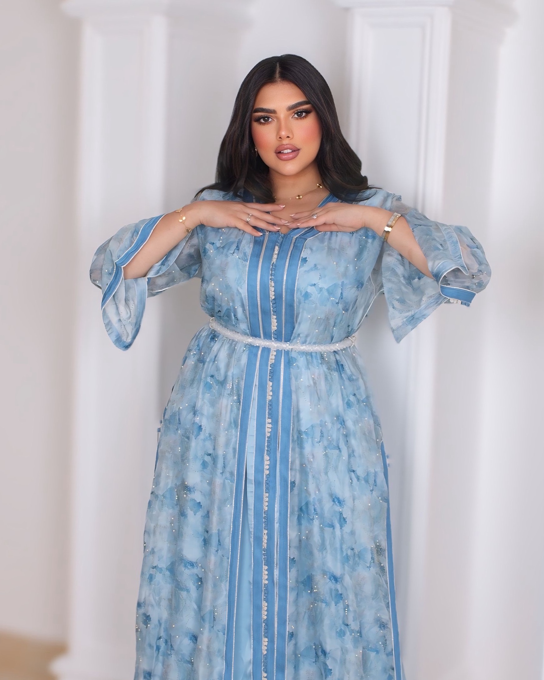 A dreamy sky-blue Mukhawar featuring a sheer printed outer layer and a smooth satin inner lining. Designed with a flattering V-neckline, contrast blue piping, and a slim braided belt for an elegant silhouette—perfect for Ramadan evenings, Eid gatherings, and special occasions.