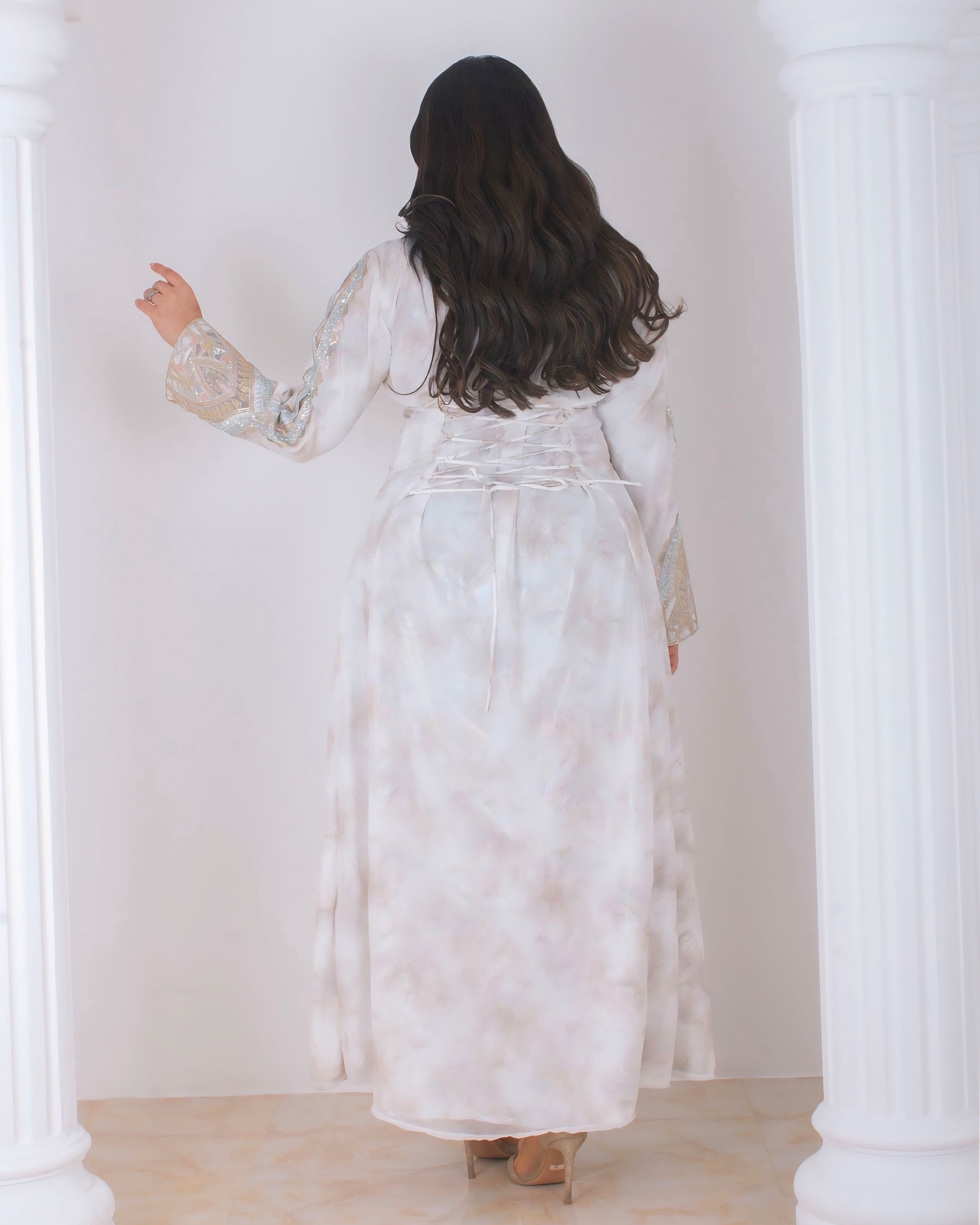 • Accents: Intricate white-and-silver embroidery along the neckline, front panel, and sleeve cuffs, paired with shimmering beadwork; complemented by a sheer peach outer layer on the sleeves for added elegance.