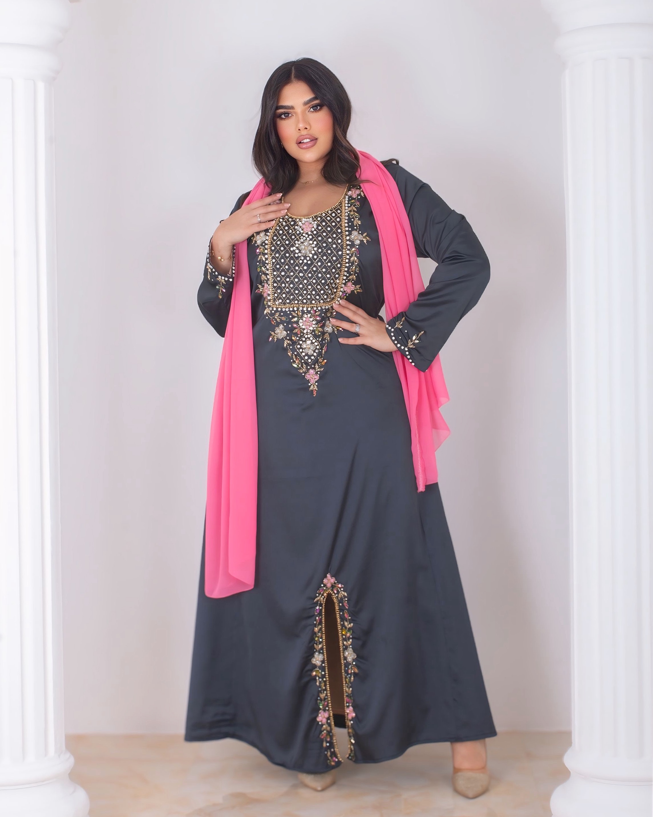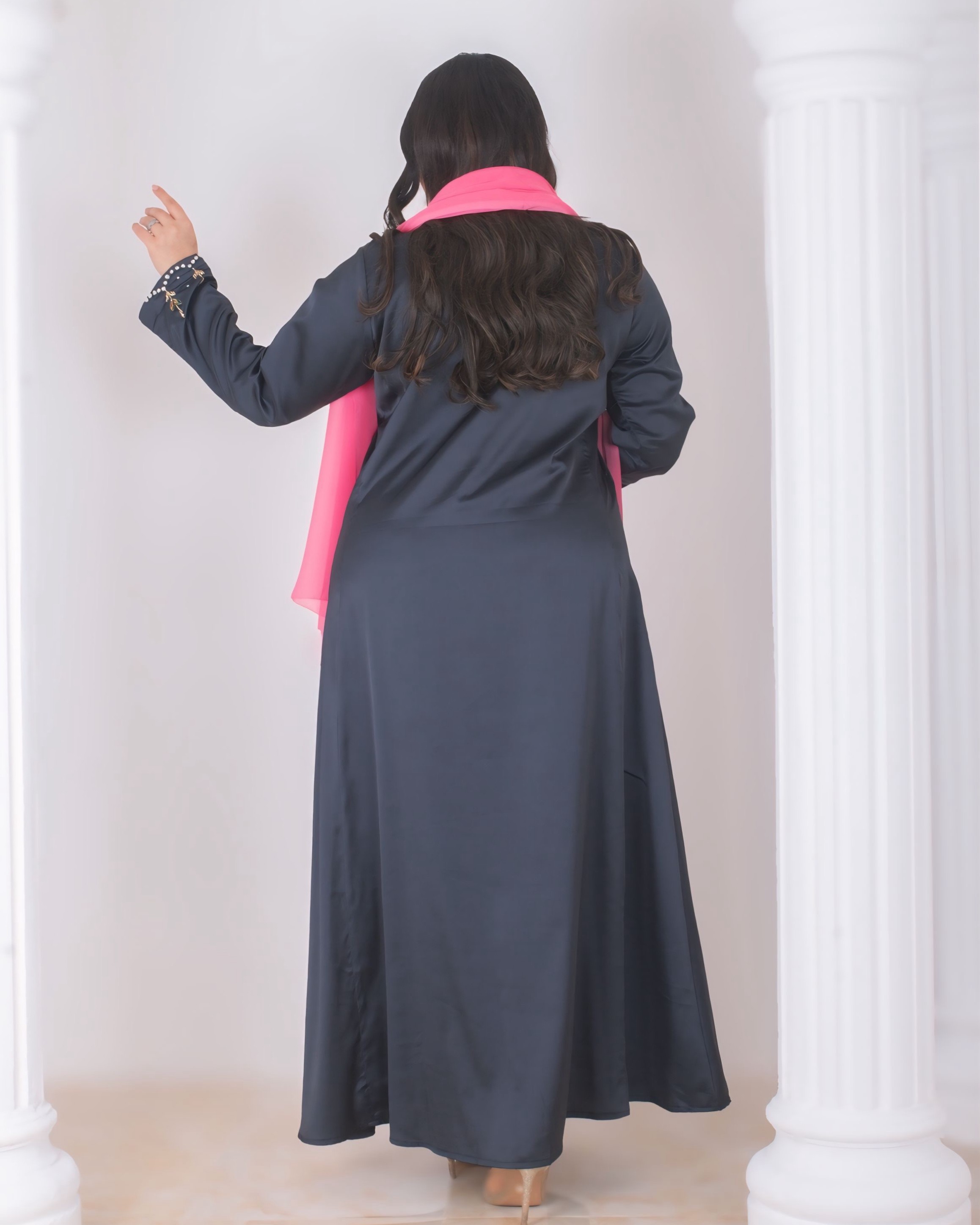 • Color: Deep charcoal grey dress with a vibrant hot-pink dupatta.