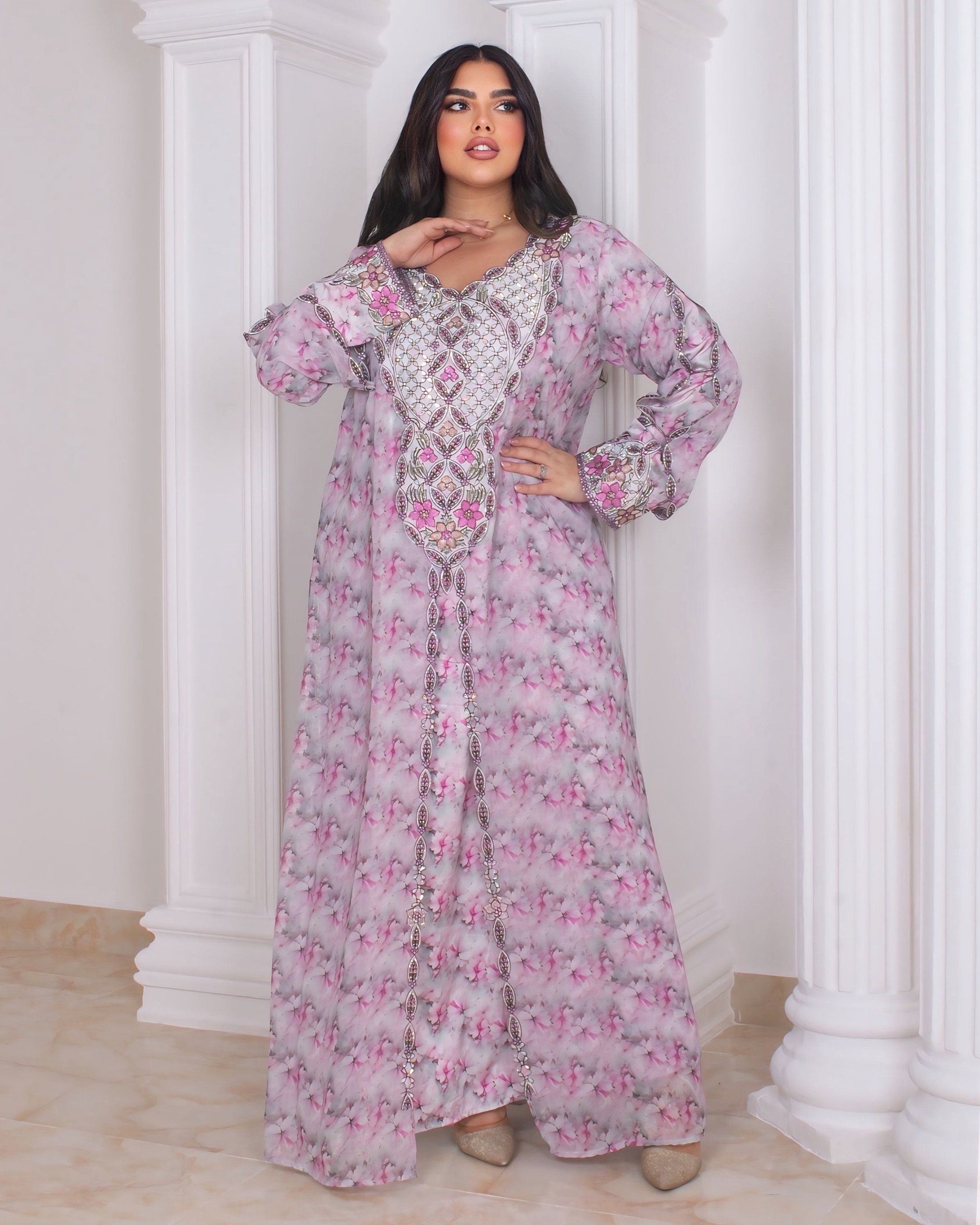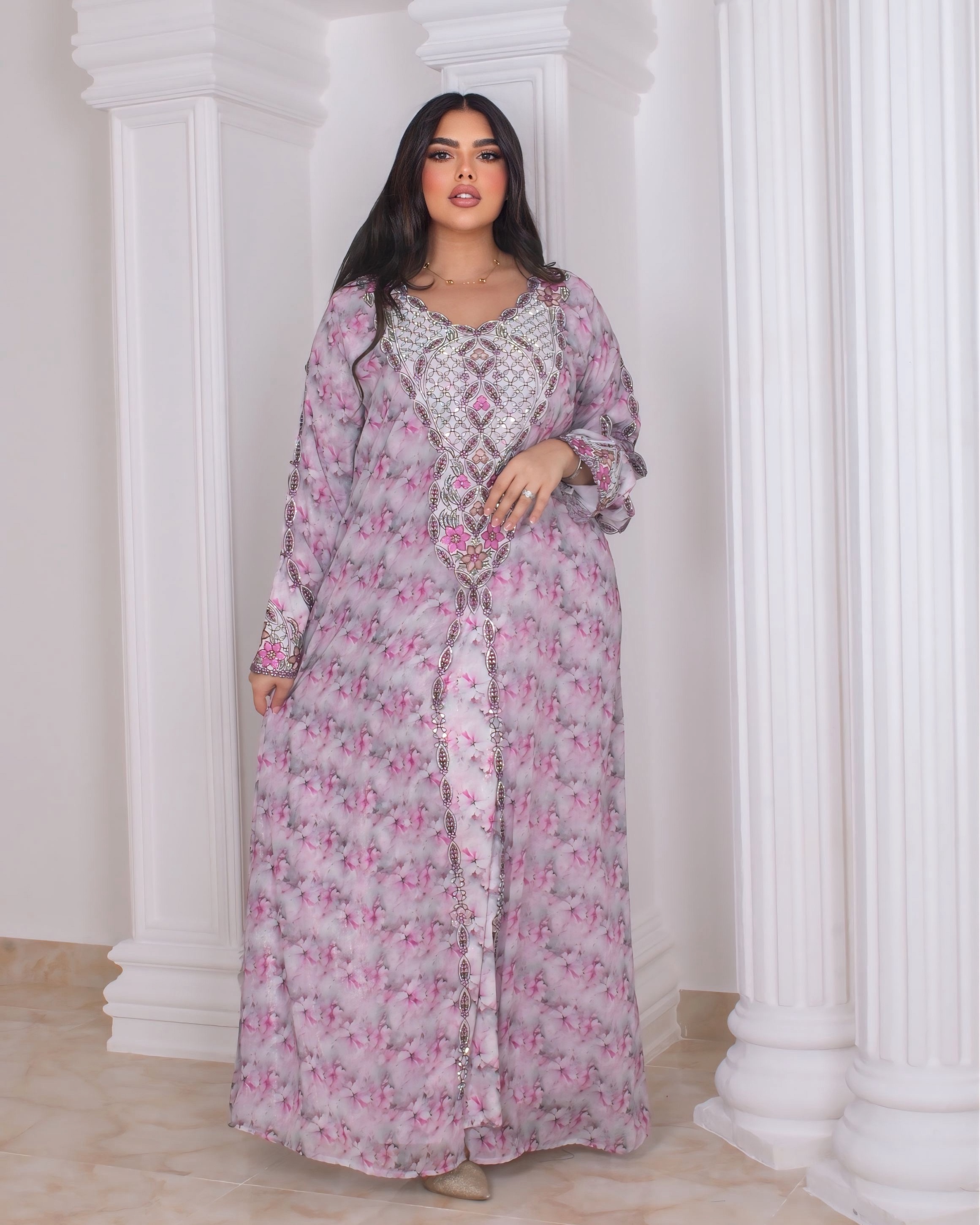 • Color: Pastel grey base with pink floral tones and white/silver embroidery